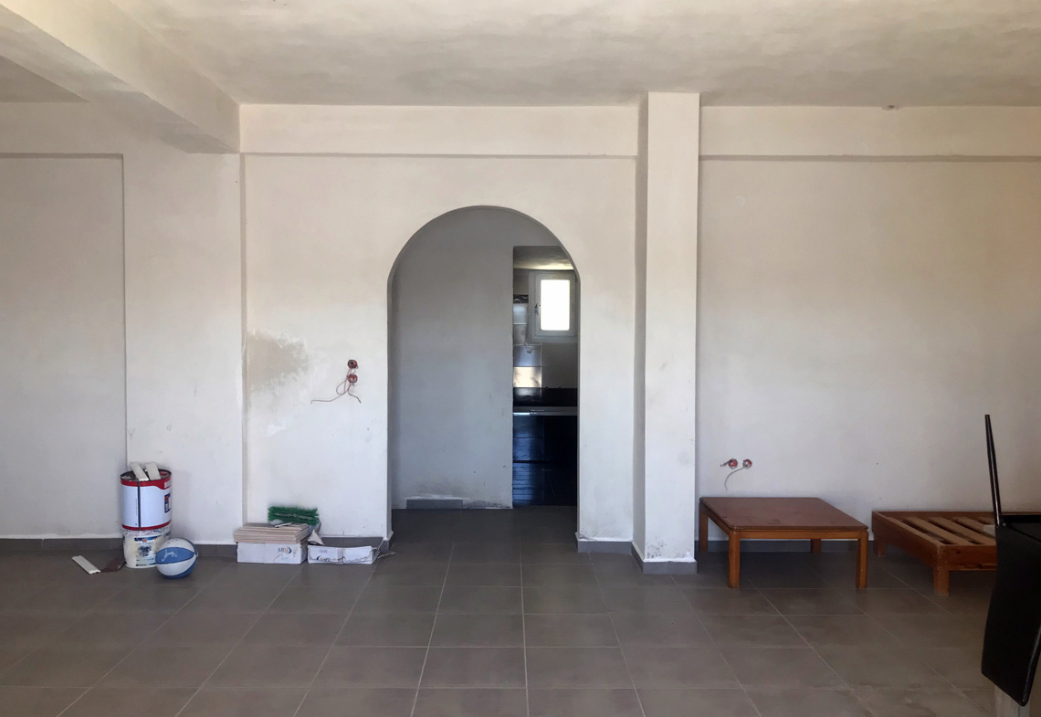 Υπάρχουν ένας ενιαίος χώρος κουζίνας/καθιστικού, τρεις βεράντες και δύο μπαλκόνια. Το εσωτερικό χρειάζεται ολοκλήρωση. Βρίσκεται στο λόφο πάνω από τον τουριστικό κόλπο του Παντελιού. Είναι προσβάσιμο με αυτοκίνητο.