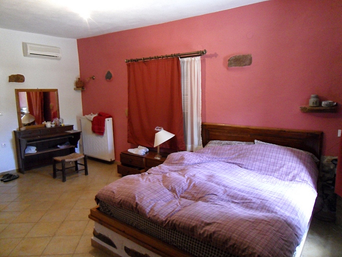 Los dormitorios son espaciosos y también están equipados con armarios empotrados revestidos de madera. El dormitorio principal tiene una cama grande construida tradicionalmente con piedra. También su propio WC con ducha.